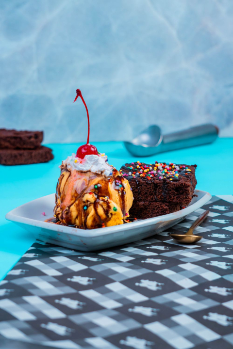 Doble brownie con helado - Dos piezas de brownie y una bola de helado cubierta con fudge, crema chantilly y un marrasquino.